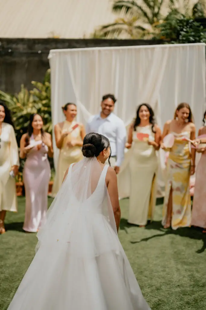 Parmi ses souvenirs les plus forts, les first look avec ses demoiselles d’honneur, sa famille, et cet instant suspendu dans l’escalier avec son papa, juste avant d’entrer. Un moment silencieux, puissant, gravé à jamais.