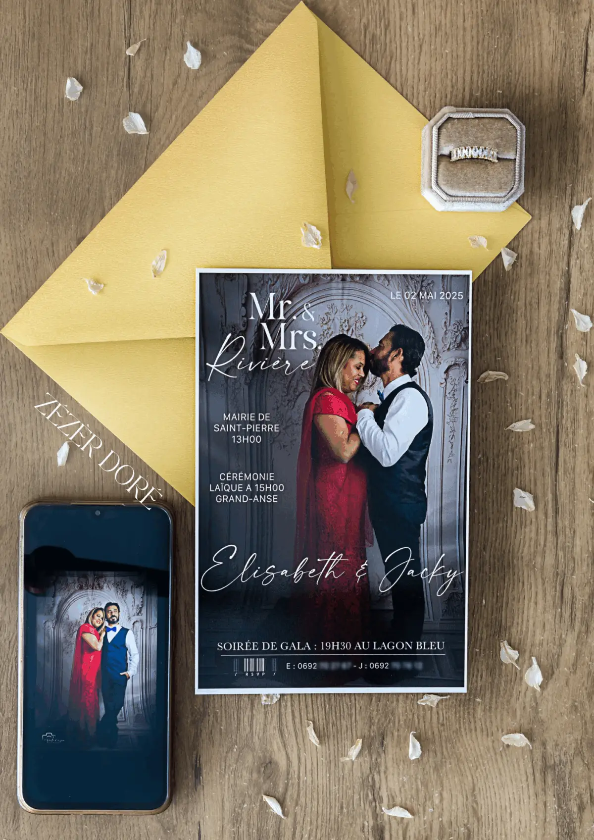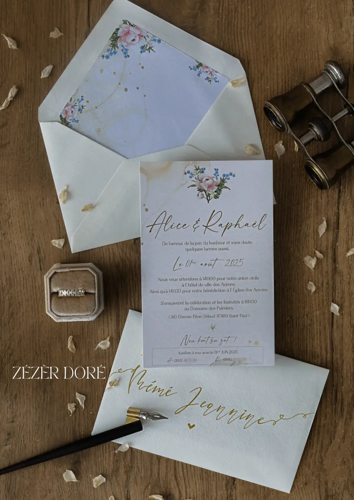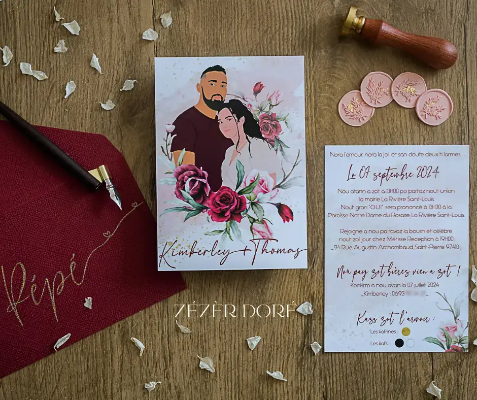 Chez Zézèr Doré, rien n’est standard, rien n’est copié-collé. Chaque création naît avec un couple, Alida et Denis, pour un couple : toi et ta moitié. Une œuvre unique, pensée, dessinée, raffinée, qui capture l’âme de votre célébration.